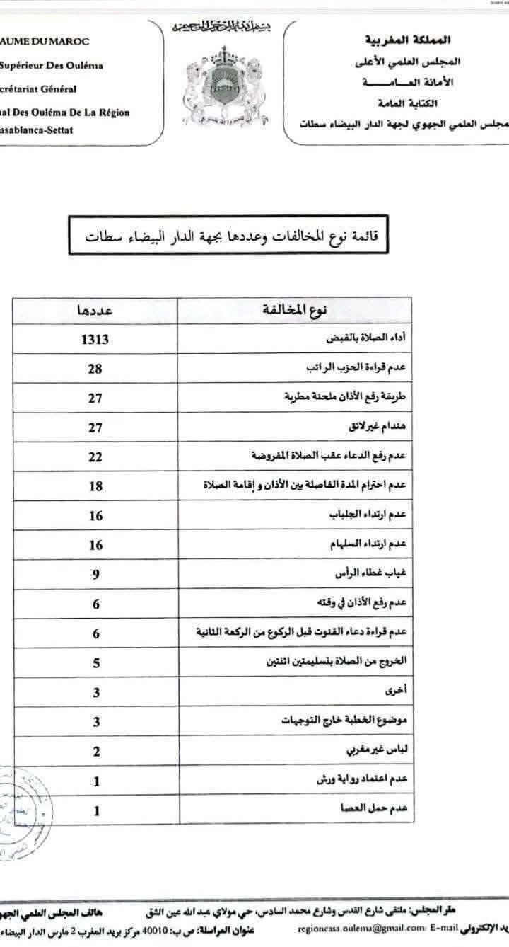 الجهة24-أثارت وثيقة رسمية صادرة عن المجلس العلمي الجهوي لجهة الدار البيضاء–سطات الكثير من السجال الفقهي والقانوني حول مجموعة من المخالفات المرتكبة من قبل بعض أئمة مساجد الجهة.وأوضحت المراسلة، بتاريخ 20 فبراير الجاري، المحالة استنادا إلى مذكرة صادرة عن المجلس العلمي الأعلى، أن هذه المخالفات تم رصدها من طرف وزارة الأوقاف والشؤون الإسلامية، وتمس ما جرى به العمل في مساجد المملكة، كما تخالف مضامين “دليل الإمام والخطيب والواعظ”.ودعا رئيس المجلس العلمي الجهوي لجهة الدار البيضاء–سطات، محمد مشان، رؤساء المجالس العلمية المحلية إلى اتخاذ الإجراءات اللازمة، من بينها عقد لقاءات تواصلية مع المعنيين بالمخالفات وفق طبيعة كل حالة، وتكثيف التأطير العلمي للأئمة والمؤذنين، إضافة إلى برمجة دورات تكوينية لفائدة الخطباء في مجال الخطابة وتنزيل خطة تسديد التبليغ.وأُرفقت المراسلة بقائمة تتضمن أنواع المخالفات وأسماء القيمين الدينيين المعنيين بها، في خطوة تهدف إلى تعزيز الانضباط وضمان التقيد بالضوابط المؤطرة لأداء الشعائر الدينية داخل المساجد. وتصدرت مخالفة أداء الصلاة بالقبض قائمة التجاوزات، حيث بلغ عدد الحالات 1313 من أصل 1528 مخالفة مسجلة، ما يمثل النسبة الأكبر بشكل واضح، متبوعة بعدم قراءة الحزب الراتب (28 حالة)، ثم رفع الأذان بطريقة ملحنة مطربة (27 حالة)، إضافة إلى 27 حالة تتعلق بالهندام غير اللائق.كما شملت المخالفات المرصودة جوانب مرتبطة بأداء الشعائر وسلوك بعض الأئمة أثناء الصلاة والخطبة، من قبيل عدم رفع الدعاء عقب الصلوات المفروضة، وعدم التقيد بالفترة الفاصلة بين الأذان والإقامة، وعدم ارتداء الجلباب أو السلهام، فضلا عن تسجيل حالات لغياب غطاء الرأس.ورصدت الوثيقة أيضا ست حالات لعدم رفع الأذان وقوفا، وست حالات لعدم الجلوس بين الركعتين، وخمس حالات للجمع بين الصلاتين دون إذن، إلى جانب حالات محدودة تتعلق بالخروج عن موضوع الخطبة، أو عدم اعتماد رواية ورش في التلاوة، أو عدم حمل العصا أثناء خطبة الجمعة. تصفّح المقالاتأزيد من 13 ألف أسرة بآسفي تستفيد من عملية قفة “رمضان 1447″ مراكش-آسفي.. أزيد من 132 ألف و890 أسرة مستفيدة من عملية “رمضان 1447”