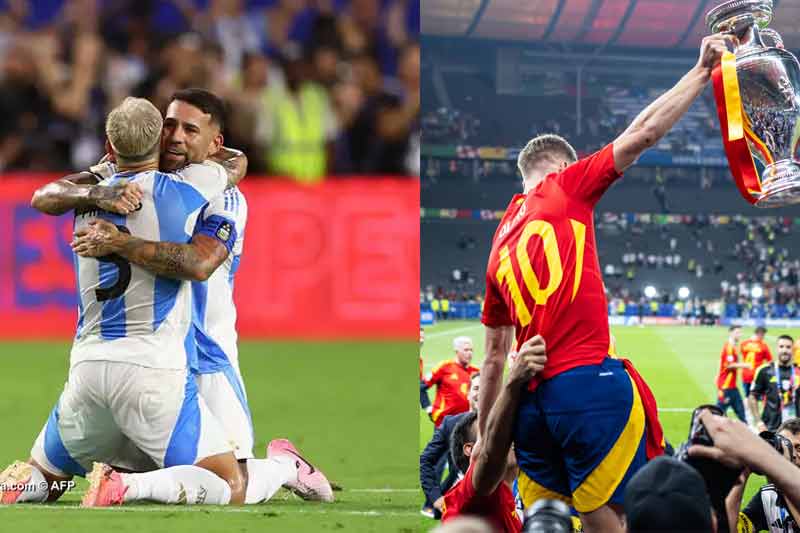 سجل لاوتارو مارتينيز هدفا قاتلا في الوقت الإضافي، ليقود الأرجنتين لحصد لقب كوبا أمريكا على حساب كولومبيا، فيما توج منتخب إسبانيا ببطولة أمم أوروبا لكرة القدم 2024 في ألمانيا بالفوز على إنكلترا بنتيجة 2/1 في المباراة النهائية يوم الأحد. وانتهى الوقت الإضافي بتعادل الأرجنتين وكولمبيا بدون أهداف، قبل أن ينجح نجم إنتر في التسجيل خلال الشوط الرابع، مهديا الأرجنتين لقبها ال16 في المسابقة. وشهد اللقاء خروج النجم الأرجنتيني ليونيل ميسي مصابا، وسط دموعه، في الدقيقة 66، ومتابعته انتصار زملائه من على مقاعد البدلاء. توج منتخب إسبانيا ببطولة أمم أوروبا لكرة القدم 2024 في ألمانيا بالفوز على إنكلترا بنتيجة 2/1 في المباراة النهائية يوم الأحد. تقدم المنتخب الإسباني بهدف أول سجله نيكو ويليامز بعد مرور 70 ثانية من بداية الشوط الثاني للقاء. ونجح المنتخب الإنكليزي في إدراك التعادل في الدقيقة 73 بهدف سجله كول بالمر بعد مشاركته بديلا بدقائق قليلة. لكن البديل الآخر ميكيل أويارزابال سجل الهدف الثاني لإسبانيا في توقيت قاتل بالدقيقة 86 بعد تبادل الكرة مع الظهير الأيسر مارك كوكوريا. وتوج المنتخب الإسباني بلقب أمم أوروبا للمرة الرابعة في تاريخه بعد أعوام 1964 و2008 و2012 ليصبح الأكثر فوزا بالكأس ويفض الشراكة مع منتخب ألمانيا الفائز باللقب ثلاث مرات. تصفّح المقالات نقابة مهنية للمبصاريين تجرّ مؤثرة إلى القضاء بسبب “بيعها النظارات الطبية” على مواقع التواصل الاجتماعي بنكيران: ما قاله الرميد لم اسمعه ولا أريد أن اسمعه!