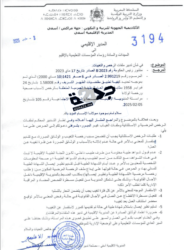 الجهة 24- آسفي بعدمَا دخل مكتبه واغلقه بإحكام منذ شهور طويلة، أمام استفحال ظاهرة الموظفين الأشباح وتغييبات الأطر التربوية وكشف ذلك للرأي العام في عدة مقالات صحافية، أستفاق أخيرا، المدير الإقليمي للتعليم بآسفي، محمد الحطاب، ووجه أمس الاثنين 03 مارس 2025، مذكرة إقليمية لرؤساء المؤسسات التعليمية بإقليم آسفي في شأن ملفات الرخص والتغيبات، داعيًا مدراء المؤسسات التعليمية إلى الإلتزام بالقانون في هذا الاطار والحرص على التدبير المحكم. وجاء في المذكرة الإقليمية أن طلبات الرخص الاستثنائية يجب أن تتضمن سبب رخصة التغيب والوثائق المبررة، مع تقديم استفسار للمعني بالأمر في حالة عدم إدلائه بالأسباب والوثائق المبررة عن فترة تغيبه عن العمل. ونصت المذكرة الإقليمية على أنه لن يتم قبول شواهد طبية مختومة من طرف طبيب داخلي، لكون اللجنة الطبية الإقليمية لا تبث في هذه الشواهد، مع التأكد من اسم الطبيب وختم الشواهد الطبية؛ و صحة المعلومات الشخصية للمعنيين بالأمر وعدد أيام الشهادة الطبية قبل تقديم نظير إيصال الشهادة الطبية للمدلي بها، والحرص في حالة قبولها على إيداع ملف الرخصة المرضية المكون من ( طلب رخصة مرضية؛ الشهادة الطبية ونظير إيصالها بمكتب الضبط بالمديرية الإقليمية داخل الآجال القانونية ، وذلك حتى تتمكن المديرية من تفعيل مسطرة الفحص المضاد و المراقبة الإدارية كلما تطلب الأمر ذلك. وأشارت المذكرة نفسها، أن الاستفسار الموجه للمعني بالأمر عن كل فترة تغيب يجب أن يتضمن اشعار بالتسلم؛ ودعت المذكرة إلى تفعيل مسطرة الانقطاع عن العمل في الآجال القانونية في حالة رفض المعني بالأمر توقيع محضر استئناف العمل بعد تغيب. وكان محمد الحطاب، المدير الإقليمي للتعليم قد أغمض عينيه عن ملف الغيابات وانقطاع الأطر التربوية عن ممارسة عملهم أو التحاقهم بالإدارة التي يحظون فيها بالتكليف منذ تعيينه على رأس المديرية، مما تسبب في إرباك غير مسبوق داخل القطاع، وبعد كشف معطيات حول تغيب أساتذة ووجود آخرين كموظفين أشباح، بدأ المدير الإقليمي في محاولات الانتقام لإخراس صحيفة “الجهة 24” التي كشفت الستار عن هذه الفضائح التي تضر مؤسسة الدولة، ولجأ الحطاب إلى وضع عدة شكايات كيدية ضد الصحيفة، إنتقاما منها. تصفّح المقالات القضاء يلاحق 636 موظفا عموميا ويقضي بإعادة 7 مليارات من الأموال المختلسة فضيحة بكلية آسفي.. حقوقيون يضعون أديهم على ملف أستاذ جامعي تم توظيفه وصرف أجرته قبل حصوله على الدكتوراه