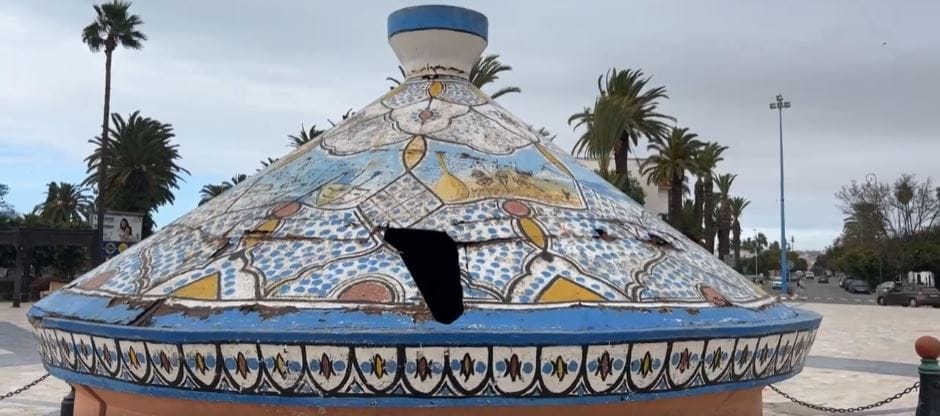بعد 21 سنة على تتبيث “طاجين آسفي” ظهر بعد الاحتفالات الأخيرة، التي اعقبت الانتصارات التاريخية للمنتخب المغربي في بطولة كأس العالم، في حالة مزرية، إذ تهشمت اجزائه، فيما تجاهلت السلطات قبل هذا الحادث، اصلاحه، بعدما غمرته الأزبال والروائح الكريهة.طاجين آسفي من الداخل اصبحَ ذا رائحة كريهة ومغمور بالازبال وجرى تدشين هذا الطاجين الذي يحتوي على زخرفة خزفية والذي بفضله انتزعت المدينة لقبها بصناعة الفخار باعتباره الأكبر عالميا في العاشر من يوليوز 1999،حيث تم إنجازه من طرف فاعلين اقتصاديين، بالقرب من مقري عمالة الإقليم وقصر البلدية. ويبلغ طوله 4،5 أمتار (14،8 قدم)، وقطره 6،3 أمتار (20،7 قدم). وطبخت به 10 أطنان من السردين يوم تدشينه، صنعت بها أكلة “الكويرات” التقليدية الشهيرة بأسفي، وتذوقها الراحل عبد الرحيم بركاش. تصفّح المقالاترغم استنزافهما للفرشة المائية مقابل التصدير..أخنوش يُدافع عن زراعة الطماطم والأفوكا إسبانيا تفتح تحقيقا قضائيا في تعنيف الشرطة لمغربيات أثناء الاحتفال بـ”الأسود”