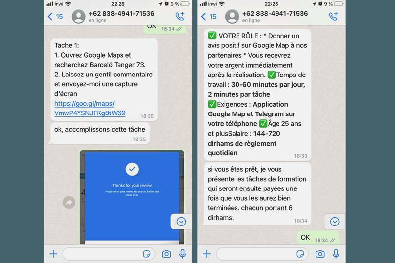 الجهة24 اقدمت شبكات نصب بأرقام من أندونسية وحسابات بنكية مغربية على استهداف مستخدمين في المغرب، من خلال تقديم عروض توظيف مشبوهة تنتشر في تطبيق التراسل الفوري واتساب و”تلغرام”. وأثارت الرسائل شكوكاً أكّدها تدقيق أجراه موقع “الجهة24” وتقارير من الهند حول استخدام هذه الطريقة لسرقة الأموال. وتبدأ عملية الاحتيال هذه بعرض عمل، وتمنح فعلاً مبالغ صغيرة مقابل مهام صغيرة “من 6 دراهم إلى 18 دراهم” مغربي، لكنها بعد ذلك تشرع في طلب بيانات شخصية، ثم طلب المال للاكتتاب في تداول مجهول. وبعد توصل المستخدم برسالة عبر الواتساب يأتي فيها: “”نحن قسم الموارد البشرية في شركة أو أم دي غلوبال (تدعي أنها شركة تسويق إلكتروني وتعزيز التواجد في نتائج البحث) ولدينا عمل قد يثير اهتمامك”. تبدأ مرحلة اخبارك بالمهام الموكولة إليك، وفي حالة التدقيق الذي أجراه موقع “الجهة24” وتقمص دور الضحية لهذه الشبكات، فقد أُقترحَ علينا القيام بالتقييم بعض الشركات والفنادق على خدمة جوجل، ومقابل هذه الخدمة سنتقاضى 6 دراهم. النصب باسم القصر الملكي والمثير في الأمر، أن شبكات النصب هذه، تستخدم اسم “القصر الملكي بالرباط” لإهام الضحايا بقربهم من السلطة وعملهم مع مراكز ذات نفوذ في الدولة، ويطلبون من الضحايا تقييم القصر الملكي بخمس نجوم على جوجل، مقابل 6 دراهم، ويؤكدون أيضًا أن هذه الخدمات يتلقونها من طرف الزبناء ويستخدمون العاملين للقيام بهذه المهام. وتبدأ علمية النصب، من خلال اخبار المستخدمين ببداية العمل ابتدءً من التاسعة صباحا، للعمل على اتمام 23 مهمة، والخمس مهام الأولى منها، تتعلق كلها بتقييم فنادق ومؤسسات عمومية وفضاءات خضراء على جوجل مقابل 6 دراهم لكل تقييم، ومن ثم تأتي المهمة التي يتم اخبارك فيها بأنها اجبارية. وهذه المهمة تتجلى في أنك يجب عليك المساهمة في عملية تداول فورية في بورصة وهمية، وتحدد مساهمتك من 250 درهم إلى 1000 درهم، وأنه بكل مبلغ ستساهم فيه ستتم مضاعفته بـ30 في المائة. تحويل مبلغ 16 درهما لفائدة ضحية – باسم المتهم الرئيس في القضايا – وفي حالة عدم القيام بهذه سيتم خصم 50 في المائة من عمولتك، والمثير، أن هذه الشبكات تبدأ في إرسال الأموال لكسب ثقة الضحايا حينما تصل لحوالي 48 درهمًا، إذ يجري التوصل بها عبر الحساب البنكي بشكل فوري. المهمة الإجبارية تقضي بطلب إرسال الأموال ابتداء من 250 درهم إلى 1000 درهم للاكتتاب في بورصة وهمية مقابل زيادة في راتبك تصل 30 في المائة إثر ذلك، تناسلت تعليقات على منشورها تؤكد وصول رسائل مماثلة إلى مئات المغاربة، بعضها من تطبيق واتساب نفسه، وبعضها في منصات أخرى مثل تلغرام. ووصلت إلى “الجهة24” رسالة مشابهة مرتين، إحداهما طلبت ترك تعليقات إيجابية مقابل تلقي أرباح في دوام جزئي. فيما قالت الرسالة الثانية إنها من شركة توظيف تابعة لـ”أمازون”، وفي شراكة مع “تيك توك”، وتوظف موظفين بدوام جزئي. من “واتساب” إلى “تليغرام”… طريق الاحتيال يبدأ بطمأنة وبدأ يتكشّف الاحتيال حول الرسائل المشبوهة في منشور نقلته صفحة تقنية مغربية، وحمل تفاصيل تؤكد شكوك المستخدمين. وقال نص المنشور: “راسلني رقم من إندونيسيا يقول إنه من خديجة، مسؤولة التسويق في شركة والت ديجيتال، مقدّمة عرض عمل”. وبالرغم من رفض المتصل للعرض، طمأنته الرسائل إلى أنه عمل لا يأخذ من وقته أكثر من دقيقة. وكانت طبيعة العمل وفق المنشور هي ترك تعليقات إيجابية على بعض المطاعم والفنادق والمقاهي، ثم تلقي تعويض بنحو دولار ونصف دولار مقابل كل مهمة. ولطمأنة المستخدم عُرض عليه خوض تجربة على فندق في خرائط “غوغل”. المرحلة التالية كانت تقتضي بالانتقال إلى “تليغرام”، وهو تطبيق مشفّر معروف بتسهيل الأنشطة غير المشروعة، ثم منح كود للضحية، وتقديم معلومات حول الحساب البنكي. ولا يملّ الخبراء من تكرار التحذير من تقديم المعلومات البنكية عبر الإنترنت، أو تقديم أي معلومات شخصية. وقال صاحب المنشور إن موظفة عبر “تليغرام” طلبت منه الاسم