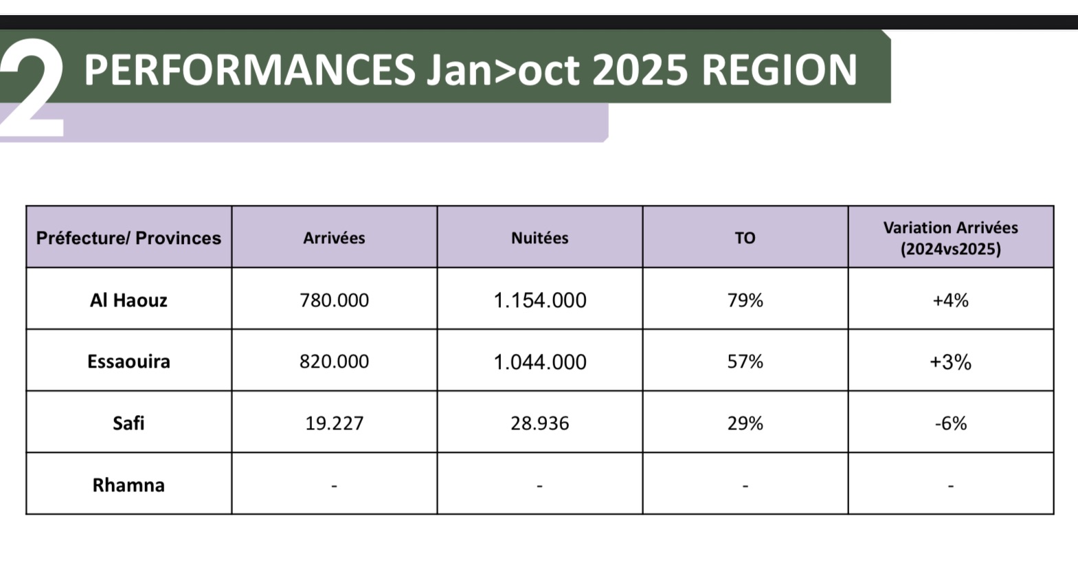 في المقابل، واصلت الصويرة تحقيق نتائج إيجابية، بعدما سجلت 1.044.000 ليلة مبيت و820 ألف وافد مع معدل إشغال بلغ 57 في المائة، ما يعزز تموقعها كأحد الأقطاب السياحية الصاعدة داخل الجهة.