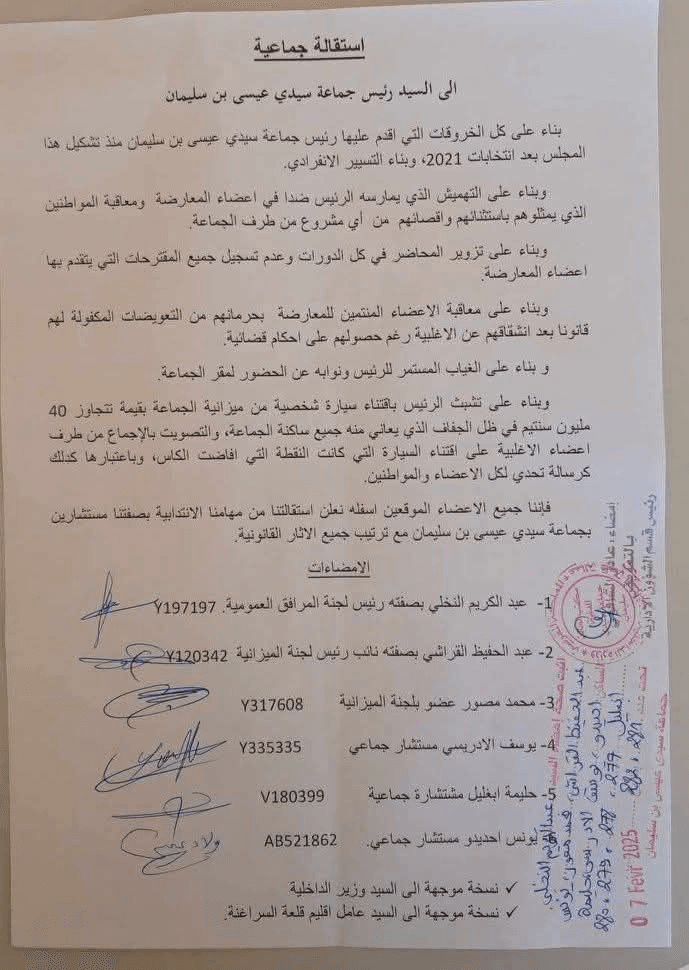 برمج رئيس جماعة سيدي عيسى بن سليمان بإقليم قلعة السراغنة، 45 مليون سنتيم، لشراء سيارة رفيعة مخصصة لتنقلاته، فيما تُعاني الجماعة من وضيعة الجفاف وانعدام المرافق الحيوية، وهو الشيء الذي أدى بستة أعضاء في المجلس المذكور إلى تقديم استقالة جماعية احتجاجًا على مجموعة من الخروقات التي سجلها فريق المعارضة على رئيس الجماعة. و اتهم الاعضاء المستقيلون ، الرئيس بـ” تزوير محاضر الجلسات وتهميش سكان المركز الجماعي”، بالإضافة إلى “إهمال أزمة نقص المياه التي يعاني منها السكان، في حين تم إعطاء الأولوية لشراء سيارة للخدمة”. ذات الأعضاء طالبوا عامل إقليم قلعة السراغنة، بـ”إرسال لجنة للتحقيق في الوضع الحقيقي في هذه الجماعة”. يشار الى أن ساكنة الجماعة تتداول خبر تعريض الرئيس لسيارته السابقة لحادثة سير ، قبل أن يبرمج شراء سيارة جديدة بـ45 مليون سنتيم. تصفّح المقالات القوات العمومية تمنع مسيرة احتجاجية لنقابة الصحة بمراكش وسط تصعيد غير مسبوق مديرة إعدادية بآسفي تُرحل تلميذة بشكل قسري في عز الموسم الدراسي وتتهمها بـ”تحريض التلاميذ على مقاطعة الأساتذة”