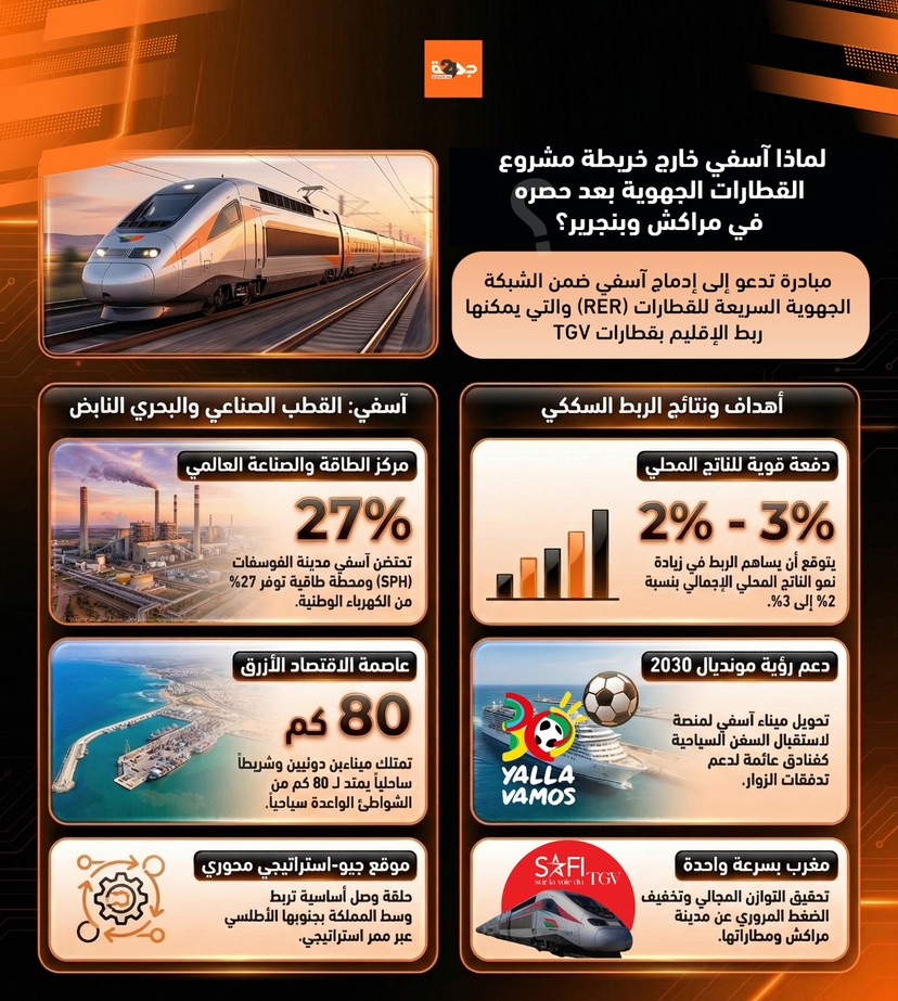 الجهة 24 – آسفيفي الوقت الذي حذر فيه الملك محمد السادس، من سن سياسات ومشاريع تجعل المغرب يمضي بسرعتين، وفي اللحظة التي ينخرط فيها المغرب في تحول غير مسبوق على مستوى النقل الحضري وبين المدن استعداداً لاحتضان كأس العالم 2030، أثار الكشف عن تفاصيل مشروع الشبكة الجهوية السريعة للقطارات (RER) تساؤلات حول التوزيع المجالي لهذه المشاريع واستمرار إقصاء إقليم آسفي وعزله. فرغم أن المشروع يستهدف ثلاث جهات رئيسية، من بينها “جهة مراكش-آسفي”، إلا أن التفاصيل التقنية كشفت عن غياب تام لمدينة آسفي وإقليمها من خريطة هذا الربط السككي الجديد.وتُظهر المعطيات الرسمية لمشروع القطارات الجهوية السريعة (RER) بجهة مراكش-آسفي أنه اقتصر على خط واحد يمتد على طول 74 كيلومتراً فقط، ليربط بين ست محطات محصورة جغرافياً بين بنجرير ومراكش. وتشمل هذه المحطات: بنجرير، المدينة الخضراء، سيدي بوعثمان، الملعب الكبير لمراكش، مراكش بالميراي، ومراكش جليز. هذا الحصر الجغرافي يعني أن حاضرة المحيط، آسفي، التي تُعد ركيزة أساسية في الجهة، قد أُسقطت تماماً من هذا المشروع الطموح الذي يهدف إلى توفير رحلات سريعة بتردد يصل إلى 30 دقيقة بين الضواحي ومركز مراكش.نداء من أجل إدماج آسفي في شبكة “البراق“وأمام خطر التهميش السككي، وبمجرد إعلان استعداد المغرب لتمديد خط القطار فائق السرعة (TGV) نحو مراكش وأكادير، خرجت للعلن مبادرة مدنية تحت شعار “نداء من أجل إدماج مدينة آسفي ضمن شبكة القطار فائق السرعة: من أجل مغرب بسرعة واحدة”. وحذر أصحاب المبادرة من خطر خلق “مغرب بسرعتين”، حيث تبقى مدينة استراتيجية ومنتجة وأطلسية مثل آسفي معزولة عن الدينامية الوطنية الحديثة لشبكات التنقل. واعتبر النداء أن إدماج آسفي هو ضمان للتماسك الترابي للمملكة وتجسيد للرؤية الملكية الرامية إلى تحقيق العدالة المجالية واللامركزية. و تستند المبادرة في ترافعها إلى معطيات اقتصادية ديموغرافية قوية؛ فإقليم آسفي يضم قرابة مليون نسمة، ويشكل صلة وصل حيوية بين وسط المملكة وجنوبها الأطلسي. وتساءل النداء عن كيف يمكن استثناء قطب صناعي يضم “مدينة آسفي فوسفاط هاب” (SPH) الممتدة على مساحة 1300 هكتار، ومحطة حرارية(Safiec) توفر 27% من الكهرباء الوطنية، وموانئ دولية، وأكبر احتياطي عالمي من الجبس، من شبكة النقل الحديثة. كما أكد التقرير أن ربط آسفي بالصويرة عبر شبكة القطارات السريعة سيساهم في فك العزلة عن الطرق الوطنية المكتظة، وسيضيف ما بين 2 إلى 3 نقاط في الناتج الداخلي الخام (PIB)، فضلاً عن خلق فرص عمل وتحفيز السياحة.ولم تكتفِ المبادرة بطرح المشكل، بل قدمت حلولاً استراتيجية مرتبطة بتنظيم مونديال 2030، وهو نفس الحدث الذي سُرّعت من أجله مشاريع (RER) في المدن الأخرى التي تحتضن الملاعب الكبرى كبنسليمان والرباط ومراكش. ويقترح النداء الاستفادة من ميناء آسفي الصناعي الجديد لاستقبال سفن سياحية ضخمة تلعب دور “فنادق عائمة” خلال المونديال. ولتحقيق ذلك، يطالب النداء بربط مباشر بين ميناء آسفي وقطار(TGV)، مع تثنية وتحديث الخط السككي نحو مراكش، مما سيجعل من آسفي “رئة لوجستية” تخفف الضغط السياحي الخانق عن مدينة مراكش ومطاراتها. تصفّح المقالاتالبرلماني محمد كريم يطالب بإدراج آسفي ضمن مشروع تمديد القطار فائق السرعة وفك العزلة عن المدينة المحامي آيت بلعربي يتقدم بشكاية أمام النيابة العامة لتسريع التحقيق في وفاة عمر حلفي عند الفرقة الوطنية للشرطة القضائية